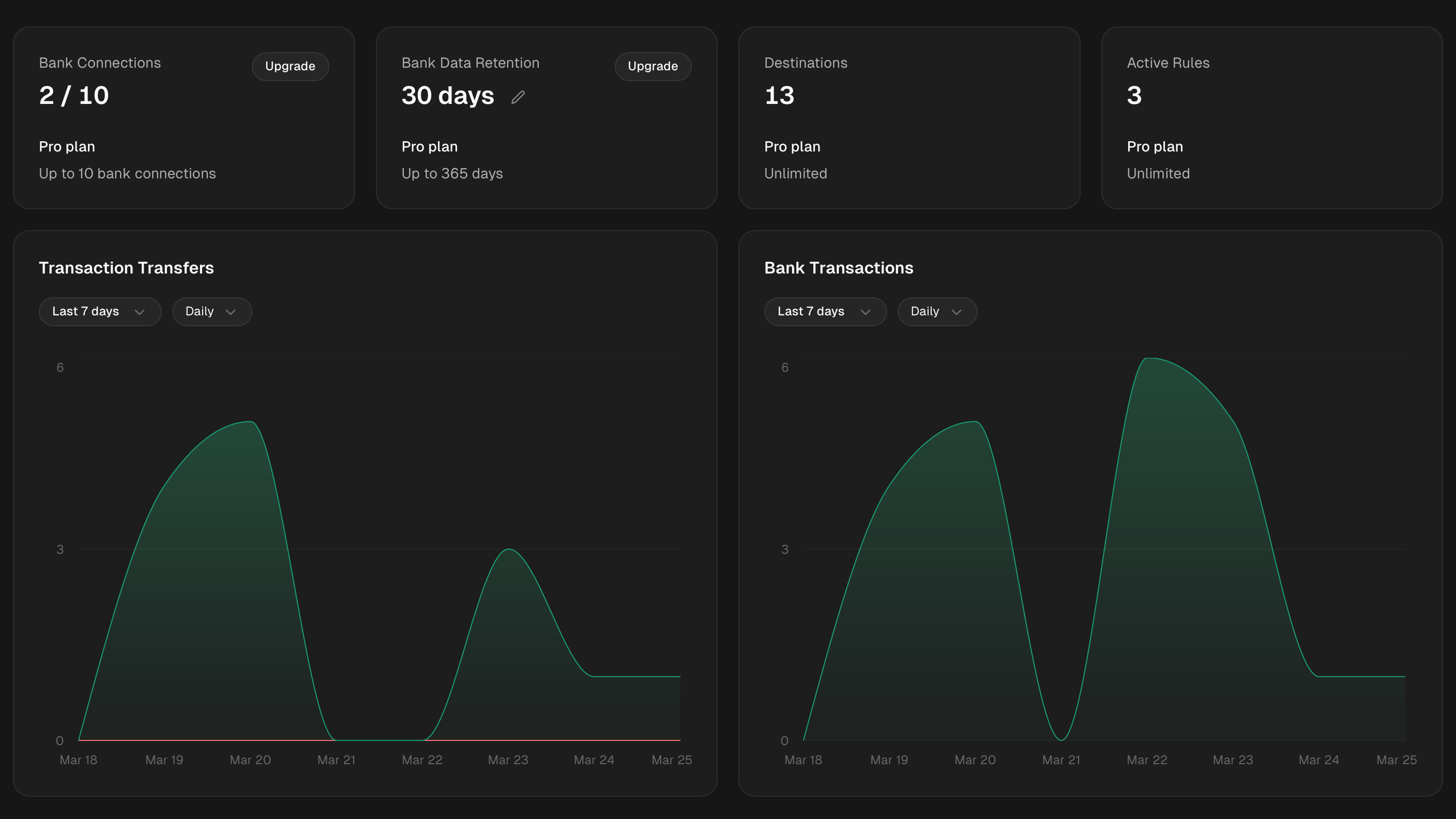 The dashboard also includes graphs that show the history of fetched bank transactions and successful or failed transaction transfers to destinations. You can customize these views by date range and data frequency, including daily, weekly, monthly, and yearly views. It’s a much better way to understand what Synci is doing at a glance, and to spot issues or trends quickly.